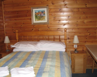 The central living space incorporates kitchen (including microwave, fridge, washer/dryer and full sized cooker), dining area with pine table and chairs and large living area equipped with two comfortable sofas, TV, DVD player and wood burning stove. French doors open on to the veranda and grassed area.